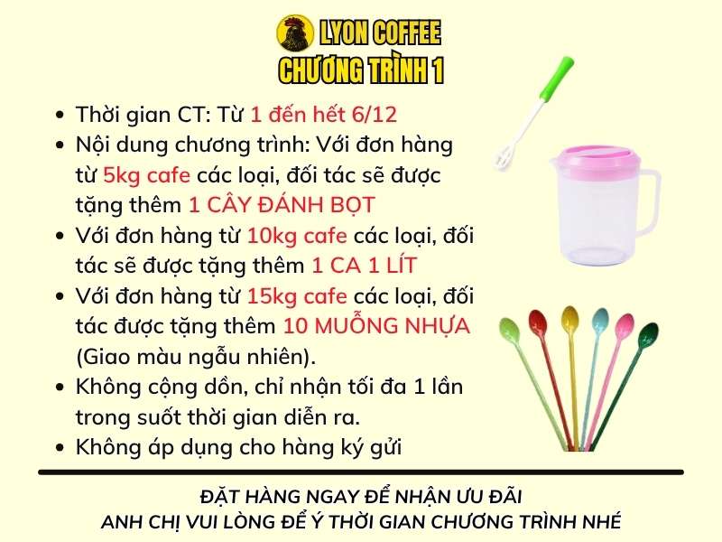 Tại Lyon Coffee, chúng tôi sẽ tổ chức nhiều chương trình ưu đãi dành cho khách sỉ (những anh/chị nhập hàng trên 5kg/đơn hàng) khi mua hàng.