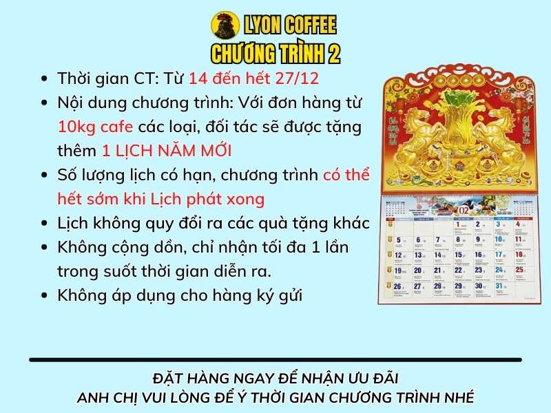 Trong tháng này, Lyon Coffee sẽ tổ chức những chương trình dành cho khách sỉ. Để tham gia đúng cách, quý đối tác xem kỹ nội dung, thời gian quy định của từng chương trình khuyến mãi.