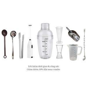 Combo 10 món pha chế chuyên nghiệp – Trọn bộ barista là bộ sản phẩm đầy đủ gồm shaker 350ml, muỗng đong, thìa bar, xúc đá, máy đánh bọt pin, kẹp gắp, vợt múc topping… Trọn bộ giúp barista hoặc quán cà phê nhỏ tiết kiệm chi phí, kiểm soát định lượng và phục vụ nhanh chóng.