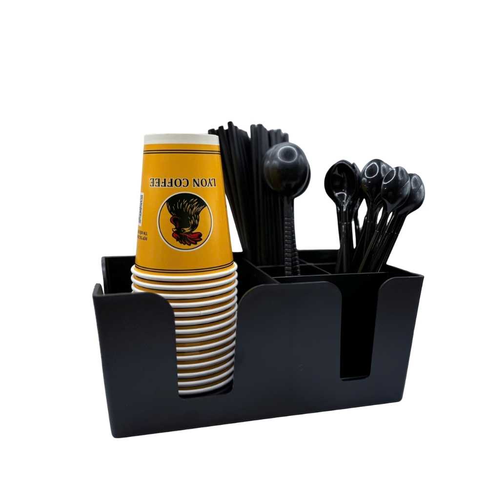 Chọn khay đựng ống hút chữ nhật 6 ngăn để quầy gọn hơn và thao tác nhanh hơn. Liên hệ Lyon Coffee để được tư vấn cách chia ngăn theo menu.