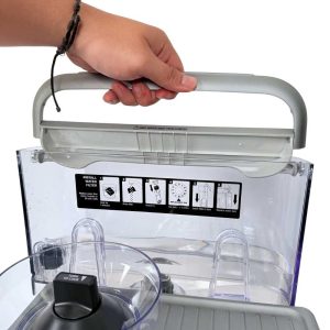 Toàn bộ thân máy làm từ thép không gỉ, kết hợp nhựa ABS ở khay chứa. Kích thước tổng thể 34 × 32 × 40cm, trọng lượng chỉ 11 kg, dễ bố trí trên nhiều loại quầy bar hoặc bàn pha chế. Thiết kế hiện đại, màn hình LCD 3.5 inch hiển thị thông số trực quan. Vệ sinh dễ dàng nhờ khay tháo rời và cảnh báo vệ sinh tự động.
