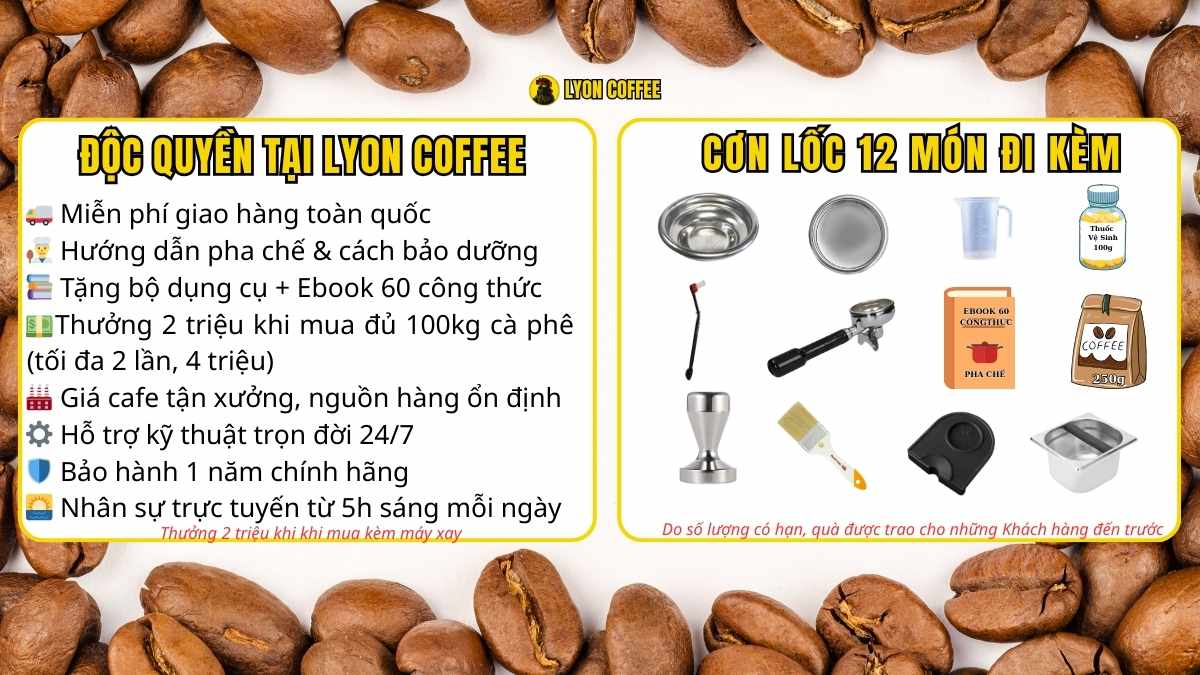 | Bảo hành | 12 tháng chính hãng | 12 tháng Lyon Coffee, kỹ thuật trọn đời |