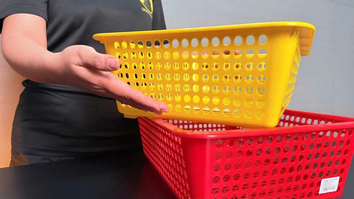 Sản phẩm có màu vàng và đỏ, giúp phân loại công năng sử dụng (thực phẩm, đồ dùng riêng biệt). Rổ nhựa màu sắc tươi sáng cũng góp phần tạo điểm nhấn cho quầy bar hoặc gian bếp.