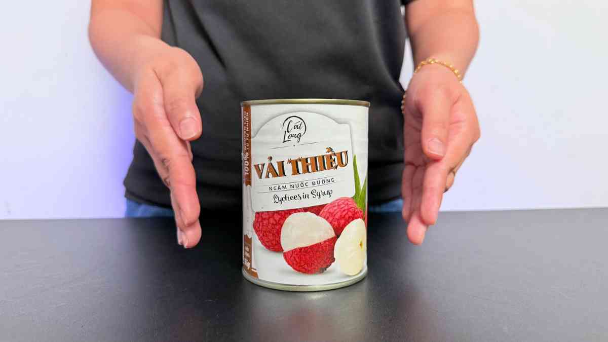- Lyon Coffee kiểm chứng thực tế: 1 lon có 15 trái vải thiều ngâm Cát Long – đồng đều, không nát.